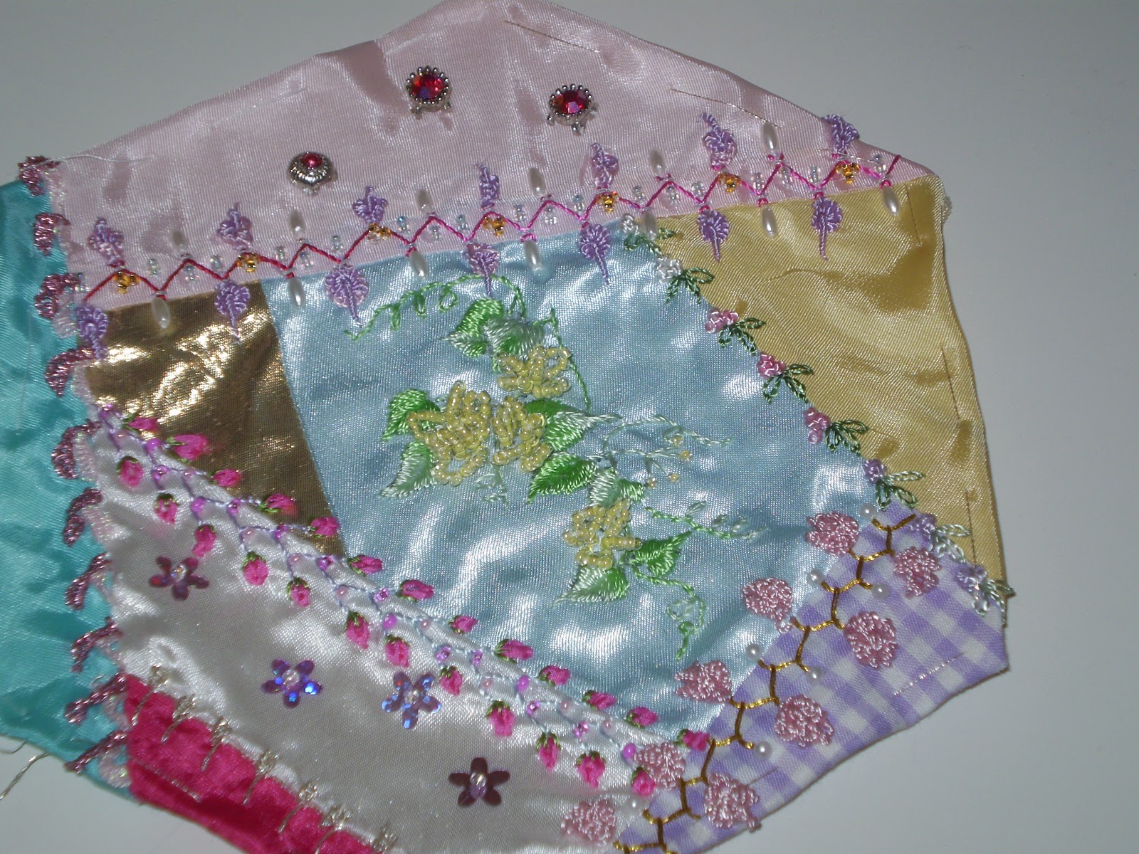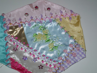 Hi welcome to my blogg. I just changed all my colors on here today and rearranged some things. I must say I haven't crazy quilted or embroidered in 6 months. I am going crazy with tatting. I can't even leave the house without taking it with me. I just find tatting so relaxing to do and it works up so fast. The pieces turn out so beautiful that I can't wait to start the next one.