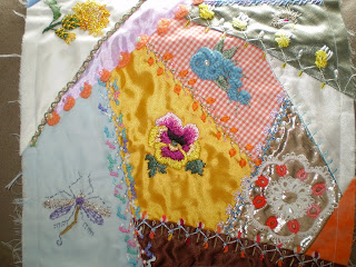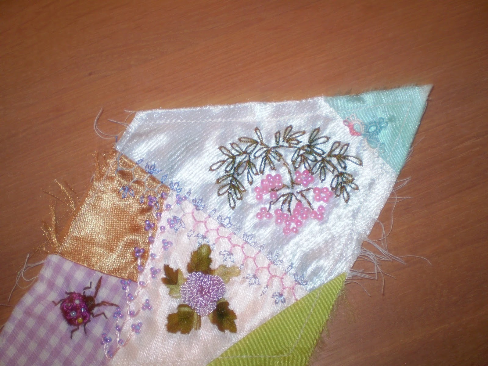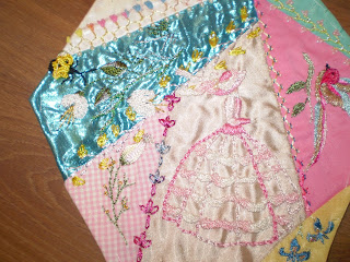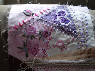 These two blocks I have finished and appliqued them down on white fabric. I think the white backround really shows all the beadwork and embroidery.